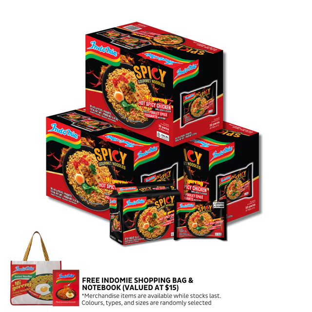 3 Boxes of Mi Goreng Hot Spicy Chicken (3 x 30 pk) + Shopping Bag + Notebook